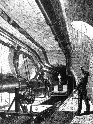 Die ersten begehbaren Leitungsgänge wurden bereits im vergangenen Jahrhundert in London (1869) und Hamburg [Hobre90] [Roepe93] (Image 5.4.4-7) (Image 5.4.4-8) errichtet. Die Begründung gab Frühling im Jahre 1910 [Frühl10] : "In der englischen Hauptstadt liegen insofern besondere Verhältnisse vor, als nicht allein der Verkehr beständig wächst, sondern auch die Versorgungsnetze im Besitz verschiedener Gesellschaften sind, denen - und zwar jeder für sich - vom Parlament das Recht verliehen ist, auch ohne behördliche Erlaubnis das Pflaster für ihre Zwecke aufzubrechen. Anlagen, welche die hiermit verbundenen Verkehrsstörungen beseitigen, sind deshalb in London mehr als anderswo am Platze."