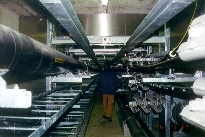 Weite Verbreitung fanden Leitungsgänge in der ehemaligen DDR und der Sowjetunion, wo mehrere hundert Kilometer in standardisierten Bauweisen errichtet wurden. Aus jüngster Zeit sind vor allem Großprojekte in Taipeh und Prag zu nennen, wo damit begonnen wurde, die leitungsgebundene Infrastruktur ganzer Stadtteile mit einem Leitungsgang-System zu erneuern. In Zürich wurde 1991 eine der modernsten Anlagen dieser Art in Betrieb genommen (Image 5.4.4-9) (Image 5.4.4-10) (Image 5.4.4-11) . In Westdeutschland sind Leitungsgänge bisher vor allem im nichtöffentlichen Bereich angewendet worden. Als Beispiele sind u.a. die Universitäten von Bochum und Dortmund und die Universitätsklinik in Heidelberg, aber auch Kläranlagen, Messegelände etc. zu nennen.