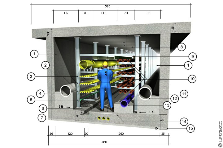 Hierbei handelt es sich um eine geschlossene, langgestreckte, begehbare bauliche Anlage zur zugänglichen Verlegung von Ver- und Entsorgungsleitungen, bestehend aus Leitunggangstrecke sowie Zugangs-, Montage-, Belüftungs-, Abzweig- und Vereinigungsbauwerken (Image 5.4.4-3) (Image 5.4.4-4) .