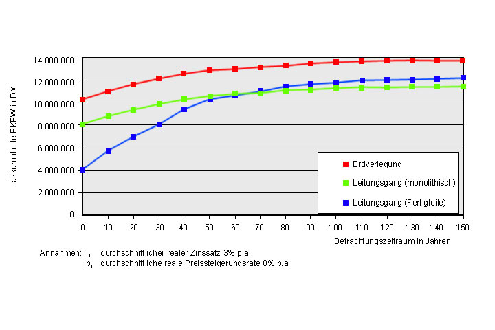 Die (Image 5.4.4-12) und (Image 5.4.4-13) zeigen die Entwicklung der akkumulierten Projektkostenbarwerte für ausgewählte finanzmathematische Varianten. Dabei ist ersichtlich, daß die Projektrangfolge zwischen Erdverlegung der Leitungen und Bau eines Leitungsganges mit Montage der Leitungen in Abhängigkeit der Zeit wechselt. Als Grundlage der Berechnungen erfolgten detaillierte, standortspezifische Kalkulationen der Investitions- und laufenden Kosten unter Beachtung allgemeiner Instandhaltungszyklen für Leitungen und Leitungsgang. Unter Berücksichtigung und Abwägung aller kostenbeeinflussender Faktoren sowie finanzmathematischer Gewichtungen zeigen die Beispiele Kosten - Nutzen - Zeiträume auf, die im Bereich der Sanierungszyklen der Einzelleitungen möglich sind. Dabei wurden indirekte bzw. vermindernde Kosten (z.B. vermiedene Leitungsschäden, Verkehrsbeeinträchtigungen u.a. indirekte Kosten (Abschnitt 5.6.1) ), die den Wirtschaftlichkeitsvergleich für den Leitungsgang noch positiver ausfallen lassen, nicht berücksichtigt. Dieses Ergebnis sollte Anlaß für die Ver- und Entsorgungsunternehmen sein, sich von der ausschließlichen Betrachtung eigener Kosten zu trennen und die Aufgabe der Ver- und Entsorgung der Bevölkerung als eine Gemeinschaftsaufgabe zu betrachten, die ein enges Zusammenwirken der Unternehmen bedingt.