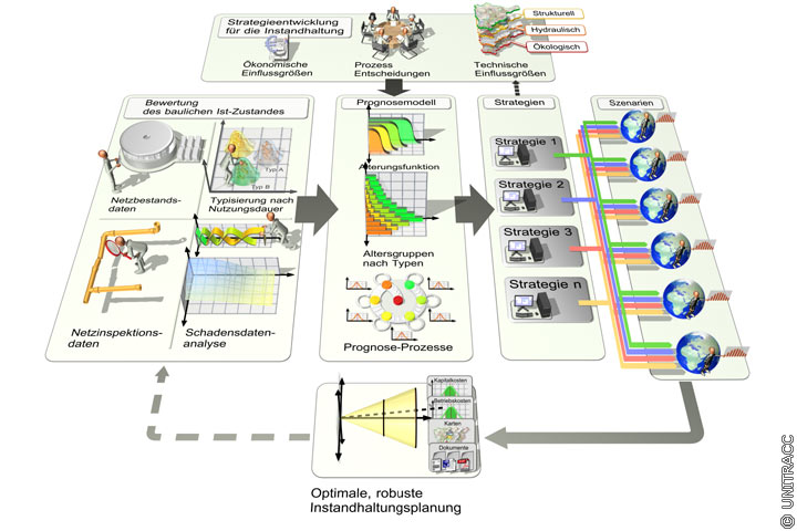 Eine netzspezifische Wirksamkeitsanalyse einer gewählten Strategie ist jedoch nur mit Hilfe fundierter und reproduzierbarer Strategieprognosen möglich. Hierzu sind neben einer realistischen Bewertung des baulichen Istzustands insbesondere belastbare Aussagen zur zukünftigen Netzzustandsentwicklung erforderlich. Diese Zustandsentwicklung lässt sich unter Zugrundelegung eines differenzierten, deterministischen Alterungsmodells aus den vorliegenden Netzdaten ermitteln.