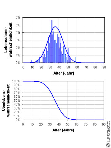 In (Image 5.7.1.1.1.1.2-1) (oben) ist eine typische Lebensdauerverteilung in Anpassung an die Weibullverteilung abgebildet. Sie beschreibt die Wahrscheinlichkeit mit der ein Baujahrgang ein bestimmtes Alter erreicht. Die Wahrscheinlichkeit mit der ein Baujahrgang ein bestimmtes Alter überlebt wird durch die Überlebensfunktion (Image 5.7.1.1.1.1.2-1) beschrieben. Diese wird aus dem Integral der Lebensdauerverteilung ermittelt.