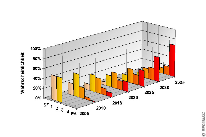 Im (Image 5.7.1.1.1.1.4-1) ist die Prognose der Substanzentwicklung für die Beispielhaltung in Fünf-Jahres-Schritten veranschaulicht. Die Anfangsverteilung stellt die heutige Substanzwertverteilung dar (vorderste Balkengruppe). Die Wahrscheinlichkeit eines Ausfalls (EA Balken) steigt kontinuierlich. Im Jahr 2035 befindet sich die Haltung mit einer Wahrscheinlichkeit von 12 % bzw. 18 % in den Substanzklassen "SBK 3" bzw. "SBK 4", während das Risiko eines endgültigen Ausfalls bereits 67 % beträgt.