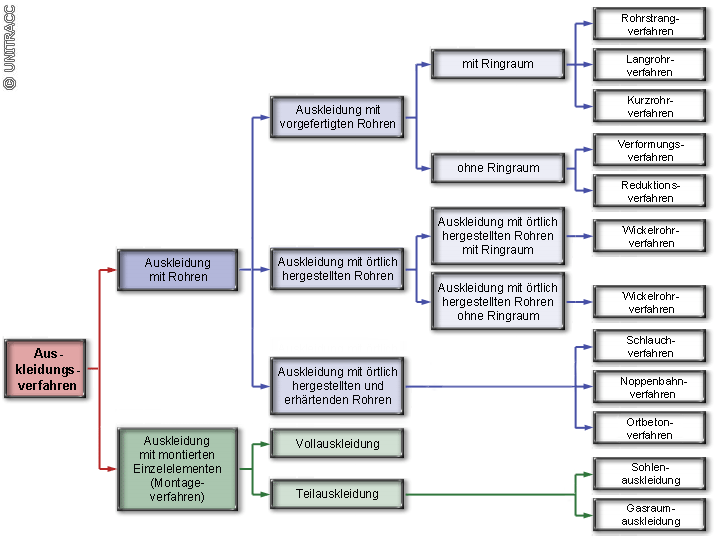 Die Auskleidungsverfahren (Rohrstrang-, Langrohr-, Kurzrohr-, Verformungs-, Reduktions-, Wickelrohr-, Schlauch- und Noppenschlauchverfahren) und die Montageverfahren werden nachfolgend unter den Verfahrensgruppen