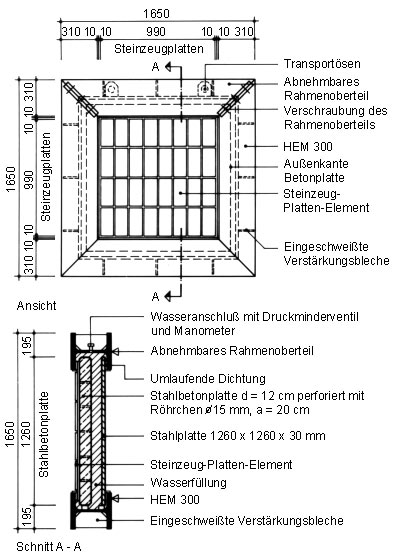 Für den hier vorliegenden Anwendungsfall kann auch die in (Image 5.3.2.1.2.1-2) und (Image 5.3.2.1.2.1-3) dargestellte großformatige Versuchseinrichtung zur Prüfung der Wasseraußendruckbelastbarkeit von Beschichtungen und Auskleidungen eingesetzt werden (Abschnitt 5.3.1.5) .