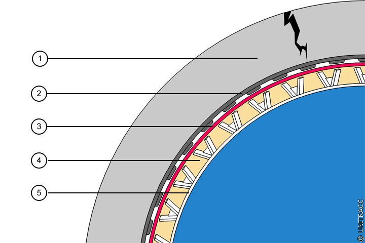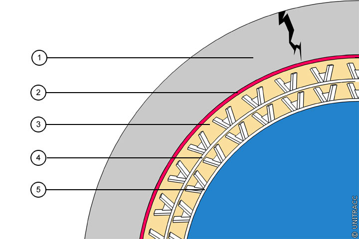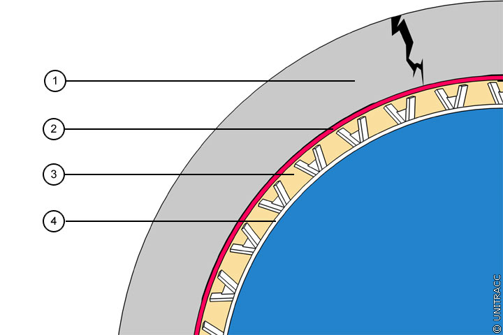 Mindestens der innenliegende Schlauch, der das spätere Gerinne des sanierten Kanals bildet, verfügt auf seiner Rückseite über Noppen (deshalb nachfolgend auch als "Noppenschlauch" bezeichnet), die als Abstandhalter zum Altrohr bzw. zum vorab installierten PE-HD-Schlauch dienen. Die Noppen definieren einen Ringraum, der mit einem hydraulisch abbindenden Injektionsmörtel verfüllt wird und dessen Wanddicke je nach gewählter Noppenhöhe zwischen 9 und 19 mm betragen kann. Ringraumverfüllung und Noppenschlauch bilden das statisch tragende Verbundsystem (Image 5.3.2.4.2-1) .