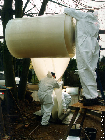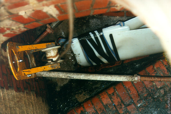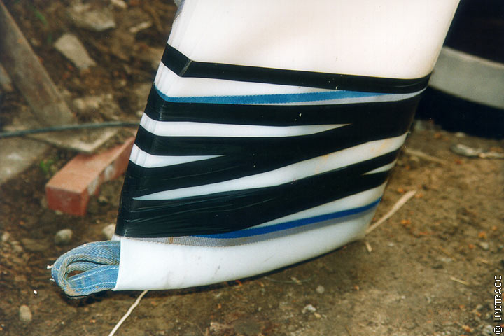 In Abhängigkeit des gewählten Systems werden, wie bereits erwähnt, ein oder mehrere auf Trommeln gewickelte Schläuche nacheinander über den Einsteigschacht in die zu sanierende Haltung eingezogen. Nach Erreichen des Zielschachtes werden die Schläuche beidseitig mit Rohrblasen abgedichtet (Image 5.3.2.4.2.4-1) (Image 5.3.2.4.2.4-2) (Image 5.3.2.4.2.4-3) (Image 5.3.2.4.2.4-4) (Image 5.3.2.4.2.4-5) (Image 5.3.2.4.2.4-6) (Image 5.3.2.4.2.4-7) und mit Luftdruck so weit rückverformt, daß das Einziehen des nachfolgenden Schlauches möglich wird. Für diesen Zweck ist sowohl im Kontrollschlauch als auch im Preliner eine Hilfsleine für die Rückholung des Windenseiles integriert. Gleichzeitig wird eine Dichtheitsprüfung nach DIN EN 1610 [DINEN1610:1997] für jeden Schlauch durchgeführt (Abschnitt 4.5.1.2) . Beim innenliegenden Noppenschlauch dient die Rückverformung zur Nachbildung der endgültigen Querschnittsgeometrie. Der erforderliche Druck von ca. 0,5 bar wird mit Hilfe von Wasser oder Luft aufgebracht und bis zum Ende der Sanierungsmaßnahme aufrechterhalten.