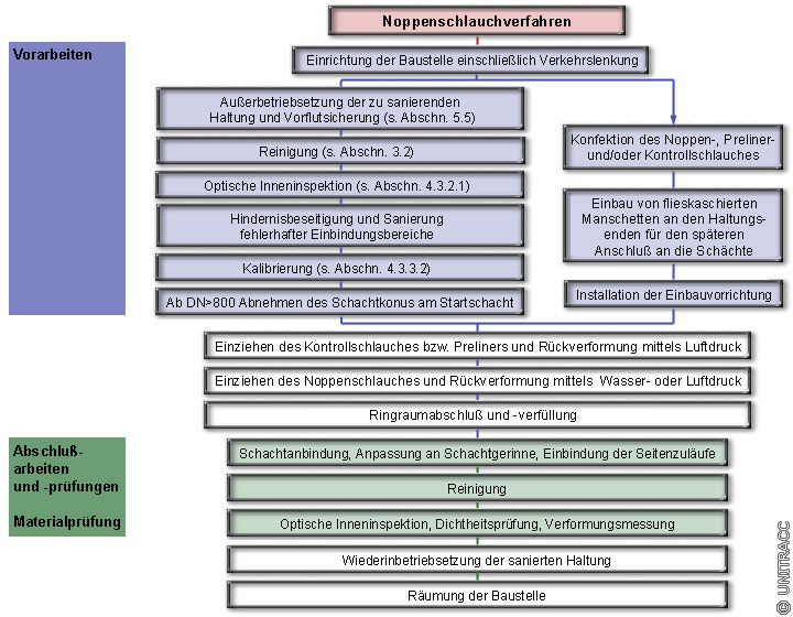 Ablaufdiagramm bei der Renovierung von Kanälen durch Auskleidung mit örtlich hergestellten und erhärtenden Rohren - Noppenschlauchverfahren [Quelle: STEIN Ingenieure GmbH]