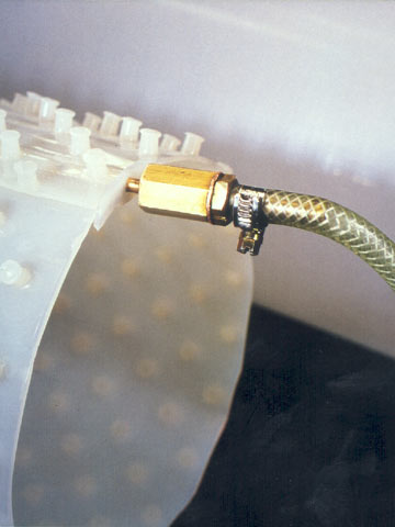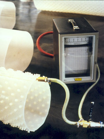 Die PE-HD-Bahnen werden zunächst auf die jeweilige Länge und das erforderliche Umfangsmaß zugeschnitten. Die Konfektionierung zum Schlauch erfolgt durch die Schweißung einer Überlappnaht mit einem Prüfkanal zur Prüfung der Naht mit Druckluft nach der DVS-Richtlinie 2225 (Teil 2) [DVSR2225-2] mit 6 bar (Image 5.3.2.4.2.2-2) (Image 5.3.2.4.2.2-3) (Image 5.3.2.4.2.2-4) .