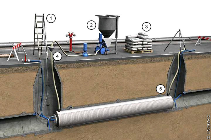 Die Ringraumverfüllung erfolgt mit einem speziell entwickelten, niedrig-viskosen, hydraulisch schnell abbindenden, hochfesten und schrumpffreien Injektionsmörtel (TROLINING®-Injektor) (Table 5.3.2.4.2.5-1) (Table 5.3.2.4.2.5-2) über einen zuvor am Tiefpunkt der zu sanierenden Kanalhaltung eingeschweißten Befüllstutzen. Am Hochpunkt befindet sich ein Entlüftungsstutzen, um eine satte Verfüllung ohne Lufteinschlüsse zu gewährleisten (Image 5.3.2.4.2.5-3) (Image 5.3.2.4.2.5-4) (Image 5.3.2.4.2.5-5).