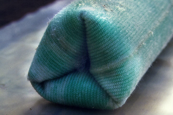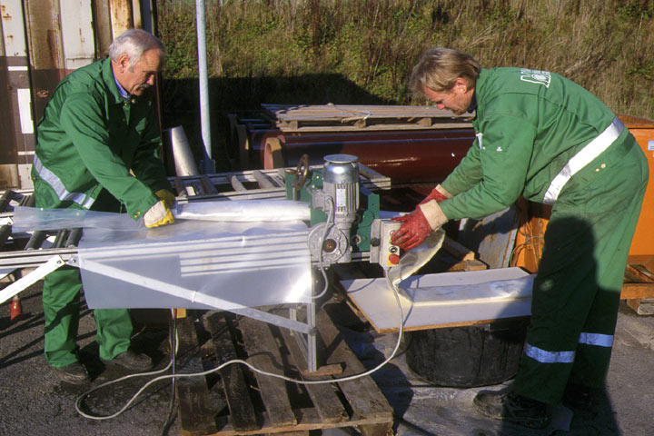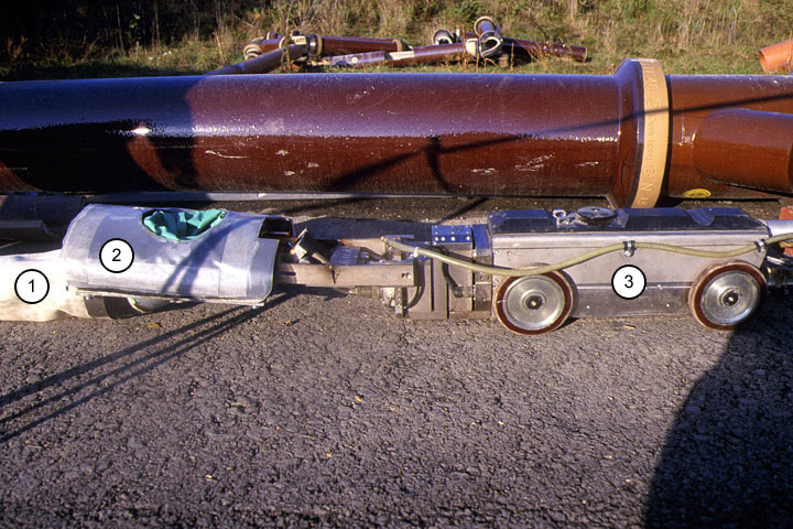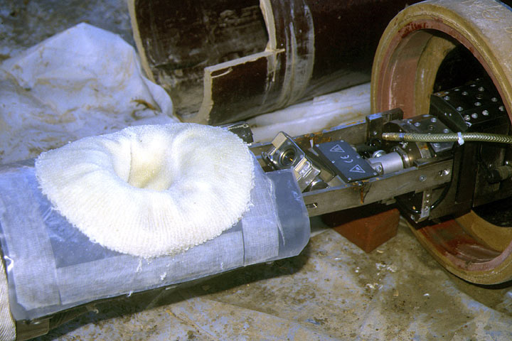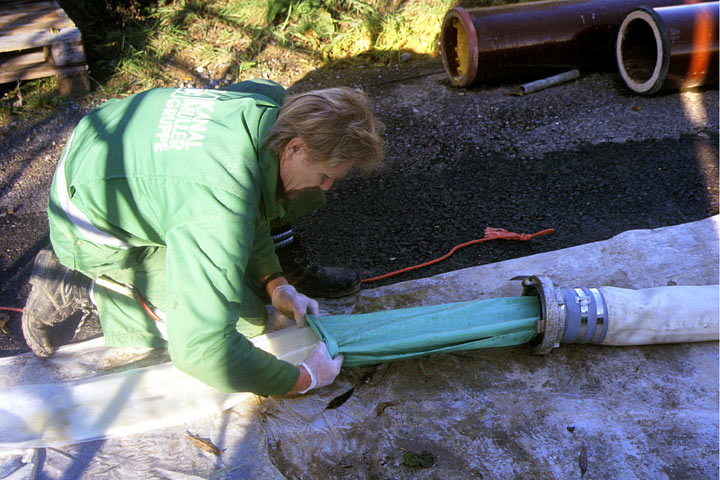 Der Inlinerschlauch besteht beim KM-Houseliner-Verfahren aus einem ca. 3 mm dicken Glasfaser-Strickschlauch, der mit eigens für die Haftung auf feuchtem Untergrund konzipiertem, kalthärtendem Epoxidharz vor Ort mit einer tragbaren Walzenanlage getränkt wird (Image 5.3.2.4.1.3.3-1) (Image 5.3.2.4.1.3.3-2) (Image 5.3.2.4.1.3.3-3) (Image 5.3.2.4.1.3.3-4) (Image 5.3.2.4.1.3.3-5) (Image 5.3.2.4.1.3.3-6) (Image 5.3.2.4.1.3.3-7) .
