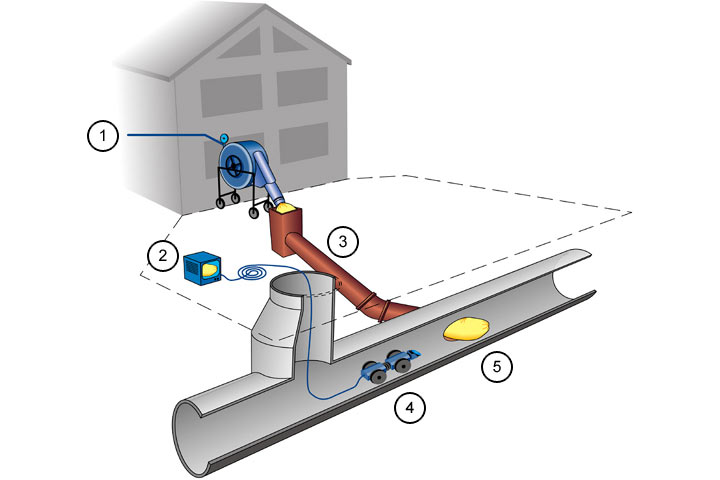 Bei der ersten Variante, auch Pull-Liner genannt (Image 5.3.2.4.1.3.5-1) , erfolgt der Einbau durch Einziehen des Inlinerschlauches bei gleichzeitiger Imprägnierung über einen Einsteigschacht oder eine Reinigungsöffnung.