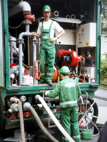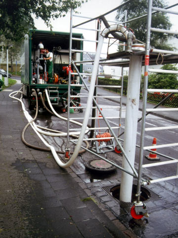 Der werkseitig getränkte und im Kühlwagen angelieferte Inlinerschlauch (Trägerschlauch) wird nach Abschluß der Vorarbeiten mittels einer Seilwinde über den geöffneten Einsteigschacht (Startschacht) in die zu sanierende und außer Betrieb gesetzte Kanalhaltung eingezogen (Image 5.3.2.4.1.2.1-1) (Image 5.3.2.4.1.2.1-2) (Image 5.3.2.4.1.2.1-3).