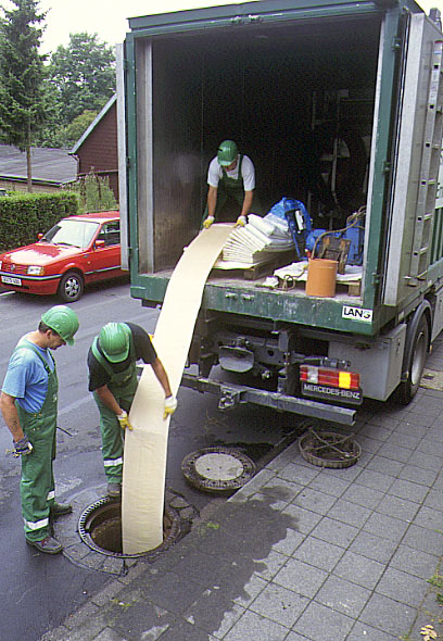 Bei Bedarf können zur Erhöhung der Tragfähigkeit des Inlinerschlauches auch Glasfasern verwendet werden, da bei dessen Einziehen im Gegensatz zum Umstülpen keine Biegebeanspruchungen auftreten.