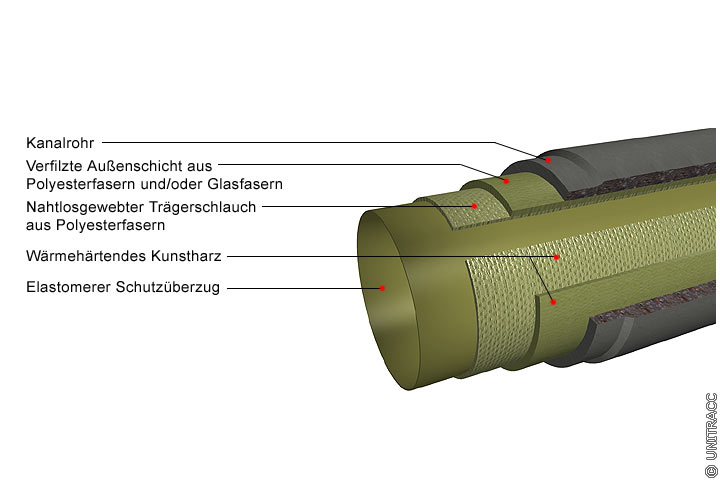 Die Tränkung des Auskleidungsschlauches erfolgt wahlweise mit niedrigviskosem Epoxid- oder Polyurethanharz mit Unterdruck zur Vermeidung von Lufteinschlüssen.