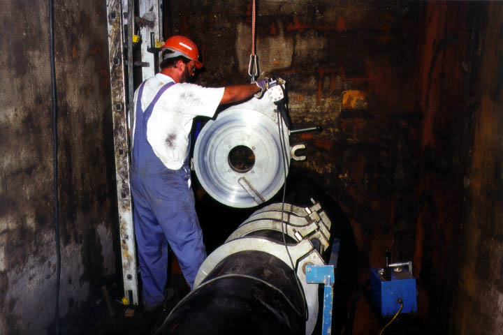 Auf das erste im Startschacht befindliche Rohr wird ein Zugkopf aufgesetzt, das Zugseil befestigt und das Rohr so weit in die zu sanierende Haltung eingezogen, daß der Rohrverbindungsbereich noch im Schacht verbleibt. Mit diesem wird das nächste Rohr zugkraftschlüssig verbunden, z.B. mittels Heizelement-Stumpfschweißung (Spiegelschweißung) bei PE-HD-Rohren (Animation 5.3.2.2.2.4.1.1-1) (Image 5.3.2.2.2.4.1.1-1) (Image 5.3.2.2.2.4.1.1-2) (Image 5.3.2.2.2.4.1.1-3) , Verschraubung (Animation 5.3.2.2.2.4.1.1-2) (Image 5.3.2.2.2.4.1.1-6) , speziellen Steckverbindungen (Image 5.3.2.2.2.4.1.1-2) (Image 5.3.2.2.2.4.1.1-3) (Image 5.3.2.2.2.4.1.1-4) (Image 5.3.2.2.2.4.1.1-5) (Image 5.3.2.2.2.4.1.1-7) (Image 5.3.2.2.2.4.1.1-8) (Image 5.3.2.2.2.4.1.1-9) oder Schellen mit Zugstangen (Image 5.3.2.2.2.4.1.1-4). Die so verlängerte Rohrleitung wird z.B. mittels Seilwinde oder Greifzug vom Zielschacht aus um eine Rohrlänge vorgezogen.