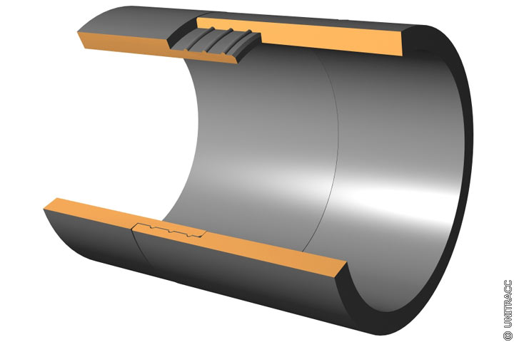 Daneben gibt es Spezialentwicklungen für das Kurzrohrverfahren, z.B. Verbindung mit innenliegender Steckmuffe (Image 5.3.2.2.2.2-2) , Verbindung mit innenliegendem BKU-Steckring (Image 5.3.2.2.2.2-3) bzw. außenliegendem Stahlführungsring (Image 5.3.2.2.2.2-4) , PE-HD-Rohr mit Steckmuffe und Verschweißung mittels Induktions-Schweißband (Image 5.3.2.2.2.2-5) , Kunststoffrohre mit Schraubmuffenverbindung (Image 5.3.2.2.2.2-6) sowie mit "Snap-in" oder "Snap-Lock"-Verbindung (Image 5.3.2.2.2.2-7) (Image 5.3.2.2.2.2-8) (Image 5.3.2.2.2.2-9) .