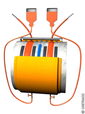Eine Alternative zur Laminatverbindung bei GFK-Rohren stellt die im (Image 5.3.2.2.2.2-11) dargestellte Injektionskupplung dar. Sie basiert auf einer GFK-Überschiebkupplung mit vier Elastomerdichtungen und einem zwischen jeweils zwei Dichtringen umlaufenden Hohlraum, der mit einem Reaktionsharz verfüllt wird.