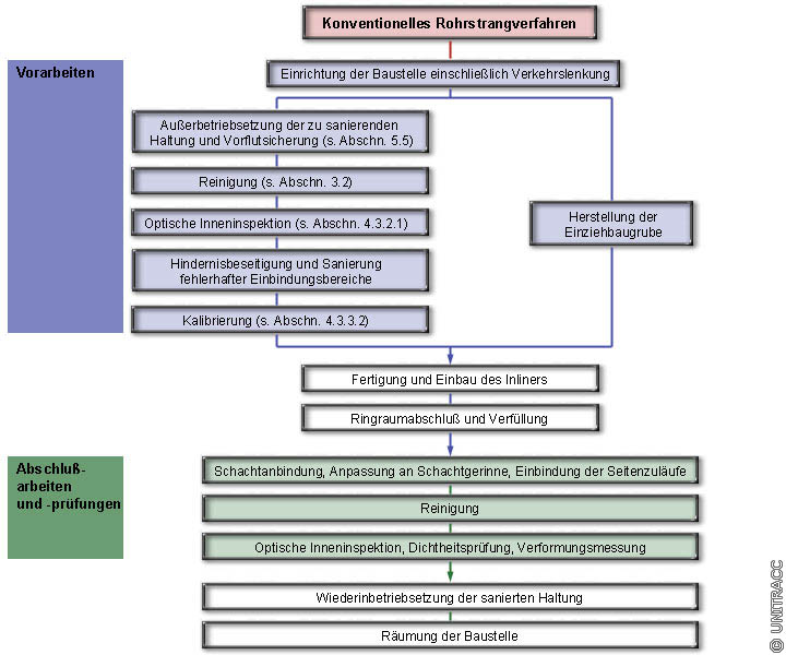 Das konventionelle Rohrstrangverfahren (in der deutschsprachigen Literatur oft als Rohrstrang-Relining bezeichnet) wurde in den 60er Jahren in Kanada unter der Bezeichnung "Bremner-Verfahren" entwickelt [Bremn71] [Bremn81] [Gale81b] [Quele81] [Cox81] [WPCFFD6] [Glenn82] [NASSCO85a] [WPCF85] [NASSCO85b] [Schro85] [WRC84a] [Stein89c] [Ewert91] [Stein86e] [Stein87e] [Stein87f] [Stein88f] [Stein88h] [Stein91c] ; es ist in den USA genormt [ASTMF58594] .