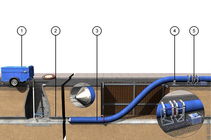 Bei diesem Verfahren wird ein entsprechend langer, flexibler Rohrstrang aus PE-HD mit Kreisquerschnitt in einem Arbeitsgang über eine Baugrube in den zu sanierenden Kanalabschnitt mit Hilfe einer Seilwinde eingezogen (Image 5.3.2.2.1.1-1) . Der verbleibende Ringraum zwischen Inliner und Kanalinnenwand wird verfüllt.