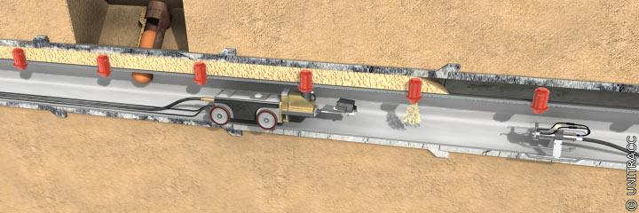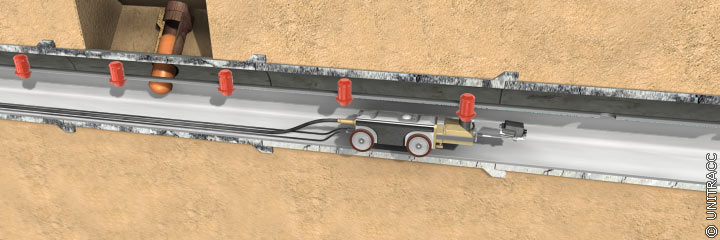 Abschnittsweise Ringraumverfüllung im nichtbegehbaren Nennweitenbereich -"Reitip Services System" in Anlehnung an [Gale82] [Quelle: STEIN Ingenieure GmbH] - Injektion eines Abschnittes bis zum Austritt des Injektionsmittels am nächsten Stutzen, danach Umsetzen der Injektionseinrichtung |