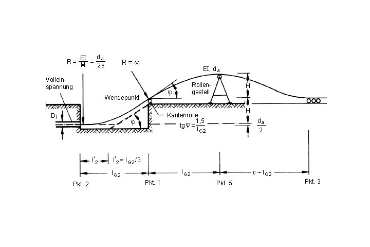 Für den Fall, daß die Aufstellung eines Rollenbocks z.B. wegen eingeschränkter Arbeitshöhe nicht möglich ist, verläuft der Rohrstrang in natürlicher Krümmung über der Geländeoberfläche bis er zum Aufliegen kommt (Image 5.3.2.2.1.1.2-5) . Die Ermittlung der Einziehbaugrubenlänge für diesen Fall erfolgt iterativ und ist ebenfalls in [Zimme91] beschrieben.