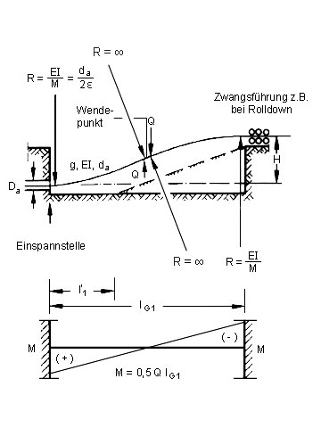 Bei der bisherigen Ermittlung der Einziehbaugrubenlänge nach [FI-Hoech] [Koch85] wird davon ausgegangen, daß die Biegekurve des Rohrstranges einem Kreisbogen entspricht, d.h., daß die Kurve an jeder Stelle die Krümmung χ = 1/R annimmt. Dies bedeutet, daß am Wendepunkt der Biegekurve ein äußeres Moment Mm = 2M angreifen muß, was in Wirklichkeit jedoch nicht der Fall ist. Tatsächlich wirkt am Wendepunkt die Querkraft Q, wodurch die Biegekurve eines Kragträgers entsteht mit dem Krümmungsradius R = ∞ im Wendepunkt und Rb = Eb I/Mb an der Einspannstelle [Zimme91] .