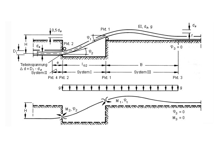 Ermittlung der Abmessung der Einziehbaugrube bei elastischer Einspannung [Zimme91] - Rohrstrang mit elastischer Einspannung am Kanal |