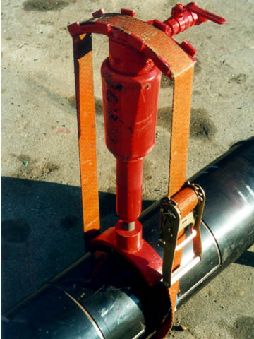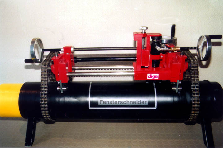 Zunächst wird die sanierte Rohrleitung durch eine Kopfbaugrube im Anschlußbereich freigelegt. Um das zu entfernende Rohrstück des Altrohres wird anschließend mit Hilfe einer pneumatisch betriebenen Hochleistungsfräse (auch Fensterschneider genannt) eine Rechtecknut erzeugt (Image 5.3.2.2.1.4.3-1) (Image 5.3.2.2.1.4.3-3) , welche die Rohrwandung derart schwächt, daß das Wandstück ohne das Risiko einer Schädigung des Inliners entfernt werden kann. Die Durchtrennung der Fräsnut des Segmentes erfolgt entweder mit Hilfe eines aufgespannten Schwingungsgebers oder einer speziellen Abziehvorrichtung (Image 5.3.2.2.1.4.3-2) [FI-DIGA] .