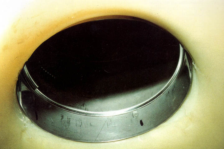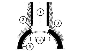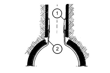 Wiederherstellung der Einbindung von Anschlußkanälen durch direkte thermo-mechanische Anformung des ohne Ringraum verlegten PE-HD-Inliners [ElKha94] - Schnitt eines fertiggestellten Einbindungsbereiches |