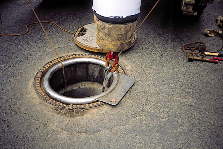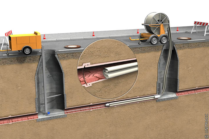 Compact Pipe Verfahren [FI-Wavin] - Einziehen des Rohrstranges über den Schacht |