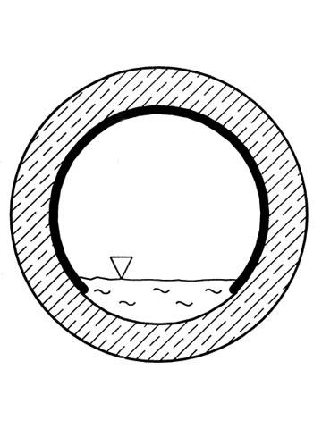 Sind selbst kleinste Öffnungen in der Auskleidung oder in den Verbindungsbereichen vorhanden und ist der Zwischenraum zwischen der Kunststoffauskleidung und der Betoninnenwand des Kanals mit Wasser gefüllt (es genügt hier ein wassergefüllter Zwischenraum von Bruchteilen eines Millimeters), so wird nach dem Prinzip der hydraulischen Presse mit der Schallgeschwindigkeit im Wasser (rd. 1.500 m/s) der Umgebungsbereich hinter der Öffnung unter diesen Druck gesetzt. Diese Druckspannungen, die in Bruchteilen von Sekunden aufgebaut werden, können zu Brüchen der Auskleidung führen. Dieses Phänomen wurde erstmalig in Hamburg bei einem mit Kunststoffplatten teilausgekleideten Sammler aus Stahlbetonrohren DN 3.500 festgestellt [Damma88] . Bei selbsttragenden Auskleidungen mit wassergefülltem Ringraum, die im Regelfall nicht für eine äußere Belastung bemessen und konstruiert werden, sollte man in jedem Fall die Möglichkeit des Auftretens dieses Phänomens überprüfen und ggf. das System für diese Belastung auslegen.