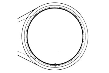 Bei der erstgenannten Variante tritt entweder kein Außenwasserdruck auf oder er wird sicher durch konstruktive Maßnahmen, z.B. durch Anordnung von Entwässerungsöffnungen zum Rohrinneren, entspannt. Bei der Verwendung von PVC-Stegfolien ist bei radialer Steganordnung eine Entspannungsfuge im Sohlenbereich anzuordnen (Image 5.3.2.5.3-1) . Bei axialer Steganordnung wird das Wasser entlang der Stege zu Querdränagen geführt und dort durch Entspannungsöffnungen im Sohlenbereich abgeleitet. Durch die Herstellung solcher Entspannungsöffnungen und -fugen wird die Dichtwirkung der Auskleidung aufgehoben. Bei der zweiten Variante muß die Auskleidung in der Lage sein, den vollen Außenwasserdruck aufzunehmen.
