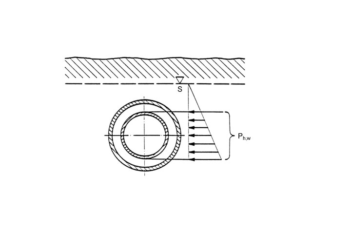 Liegen die zu sanierenden Rohrleitungen im Grundwasserbereich wird bei undichten bzw. wasserdurchlässigen Rohren der Kunststoffinliner durch die Grundwassersäule über dem Rohrkämpfer belastet (Image 5.3.2.6.4.2-1) . Für unverdämmte, drucklos betriebene PE-HD-Rohre ohne seitliche Stützwirkung gelten dann z.B. die in Versuchen ermittelten Beuldrücke pk nach (Image 5.3.2.6.4.2-3) . Andere empirische und analytische Berechnungsansätze sind im (Abschnitt 5.3.2.6.1) beschrieben.