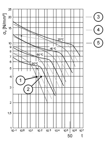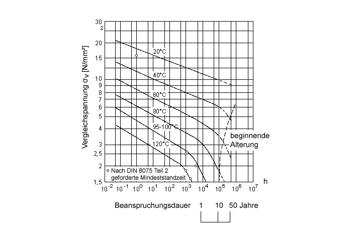 Die der Berechnung zugrundeliegende Vergleichsspannung wird in Abhängigkeit von Betriebstemperatur und Betriebszeit den Zeitstanddiagrammen (Image 5.3.2.6.4.1-2) (Image 5.3.2.6.4.1-3) entnommen. Gemäß den jeweiligen Einsatzbedingungen werden die aus dem Zeitstanddiagramm ermittelten Vergleichsspannungen (Mindestwerte) mit Sicherheitsbeiwerten versehen.