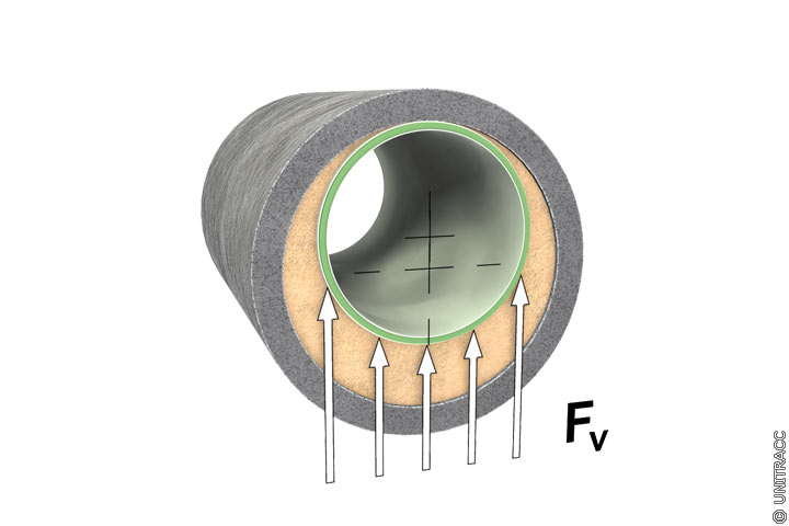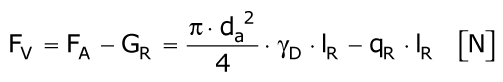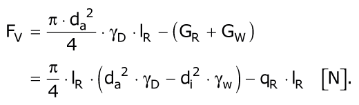 Bei der Verfüllung des Ringraumes zwischen altem Rohr und eingezogenem PE-HD-Rohr mit einem Dämmer vom spezifischen Gewicht γD > γR (γR = spezifisches Gewicht des Rohres) wird das ungefüllte PE-HD-Rohr durch die Kraft Fv (Formel 5.3.2.6.3.2.1) beansprucht (Image 5.3.2.6.3.2.1-1).