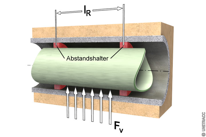 Sofern ein Aufschwimmen der Rohre vermieden werden soll, sind die Rohre mit Abstandhaltern zu zentrieren. Die Abstände auf dem Rohr richten sich nach der zulässigen Durchbiegung (Image 5.3.2.6.3.2.1-4) (Abschnitt 5.3.2.2.1) .