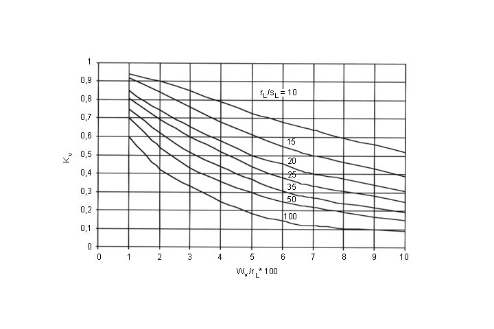 Der für das Beulen maßgebende Öffnungswinkel 2φ1 wurde für den kleinsten Beuldruck ermittelt, so daß für den Stabilitätsnachweis nur noch die Lage φv und die Tiefe der Vorverformung frei wählbare Größen sind. Die aufgrund von Parametervariationen ermittelten Werte des Abminderungsfaktors κv können (Image 5.3.2.6.1.2.7-2) entnommen werden. Mit 1% < wv < 10 % und 10 < rL/sL < 100 sollen die in der Praxis vorkommenden Fälle abgedeckt werden.