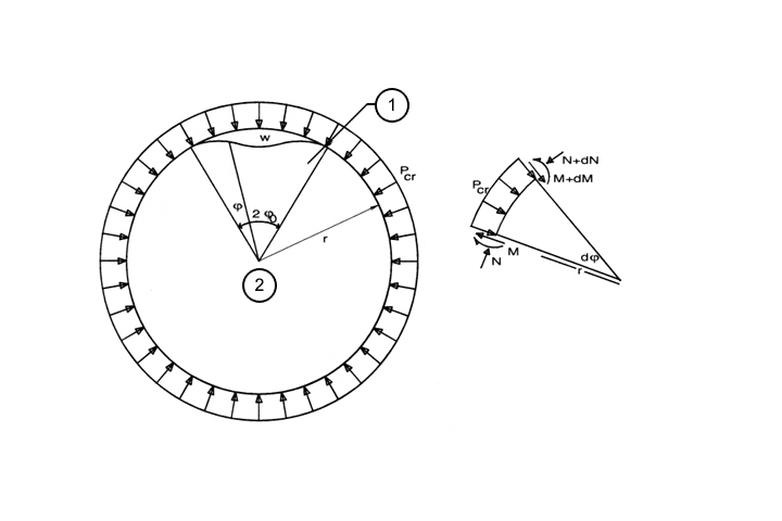 Glock analysierte das Stabilitätsproblem eines starr ummantelten, linear elastischen Kreisrings unter Außenwasserdruck unter Verwendung geometrisch nichtlinearer Verformungsbeziehungen nach der Energiemethode. Reibung zwischen Rohr und Ummantelung, Imperfektionen der Belastung und Geometrie sowie nichtlineares Werkstoffverhalten wurden nicht berücksichtigt. Ein Ablösen des Rohres von der Ummantelung wird durch die aus den Umfangsspannungen resultierende Umfangsverkürzung (EA ≠ ∞) bedingt (Image 5.3.2.6.1.2.3-1) . Die damit einhergehende Verformung beschreibt Glock durch den Ansatz: