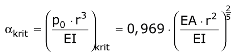 Die Parameter w1 und φ0 lassen sich aus der ersten Variation des Gesamtpotentials in allgemeiner Form als Funktion der Belastung ermitteln, so daß schließlich der kritische Wasserdruck mit dem dimensionslosen Lastparameter αkrit in Beziehung steht über:
