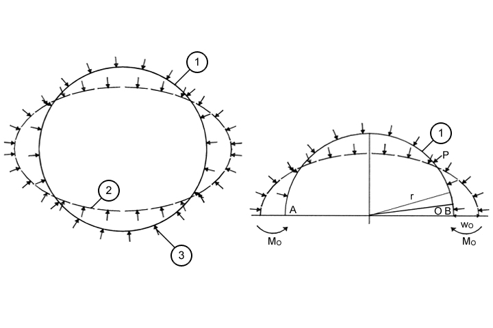 Timoshenko beschreibt das Beulverhalten des freien, dünnen Ringes, der mit einem konstanten Außendruck radial belastet wird. Im Falle einer beliebig kleinen Anfangsverformung kommt es unter kritischer Belastung zum Beulen des Kreisringes, wie im (Image 5.3.2.6.1.2.1-1) dargestellt.