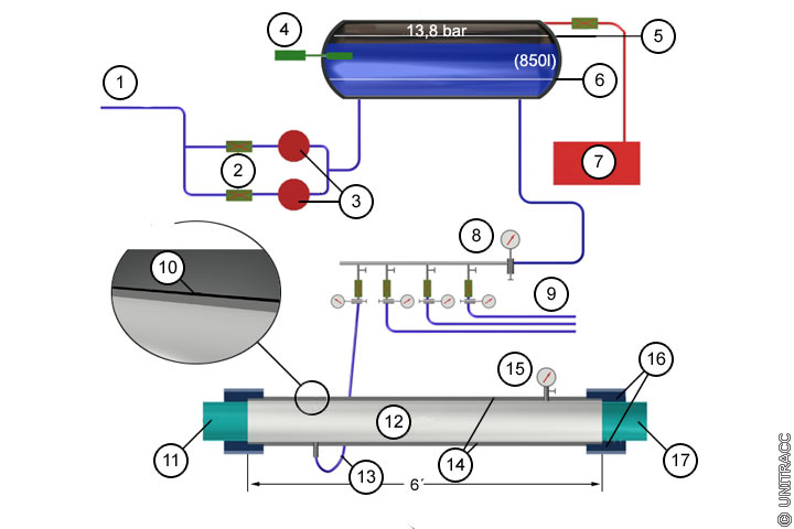 Das eingesetzte Dichtungssystem zwischen umhüllendem Stahlrohr und Inliner ist im (Image 5.3.2.6.1.2.10-1) dargestellt. Messungen mit verschiedenen Altrohrlängen ergaben, das bei einer minimalen Länge von 1,83 m und einem Innendurchmesser von 305 mm das Beulversagen des Inliners nicht durch die Einspannung im Stahlrohr beeinflußt wurde. Den Versuchsrohren wurde das Wasser unter einem Druck von 14 bar über einen Regler, direkt zwischen Inliner und Stahlrohr zugeführt. Das System war auf ein gleichzeitiges Versagen der Hälfte aller Versuchsrohre ausgelegt.