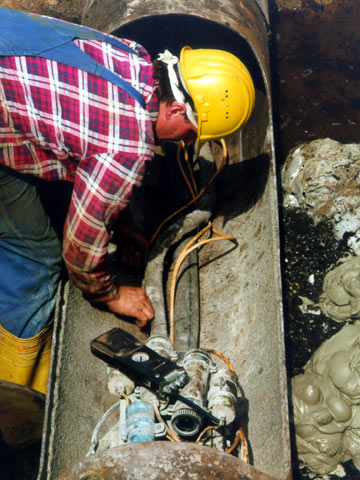 Bei Druckleitungen aus Stahl werden die erforderlichen Arbeitsöffnungen in einer Baugrube durch Heraustrennen eines ca. 2 m langen ganzen Rohrstückes oder aber durch Heraustrennen von 2 m langen Halbzylinderschalen mit abgeschrägten, besser abgerundeten Ecken hergestellt (Image 5.3.1.9.1.2.1-1) .