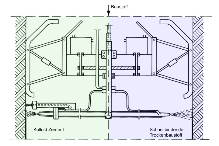 Prinzipskizze eines Spritzautomaten für Trocken- (rechts) und Naßspritzverfahren (links) zur Beschichtung von Großbohrlöchern im Steinkohlenbergbau [Großk85]