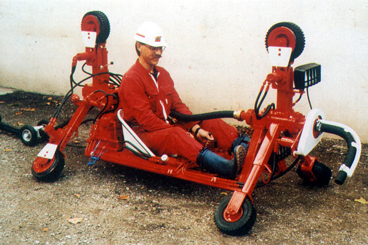 Einen ersten Ansatz stellte die beim Preload-Verfahren [Atkin50] in den 40er und 50er Jahren eingesetzte Spritzmaschine dar. Bei dieser für die Beschichtung von Wasserleitungsrohren mit Kreisquerschnitt konzipierten Maschine erfolgte der Mörtelauftrag im Trockenspritzverfahren über eine rotierende Spritzdüse. Zum Glätten dienten, wie bei den Anschleuderverfahren, rotierende Glättkellen. Die Bedienung wurde vor Ort von einem auf der Maschine mitfahrenden Maschinenführer vorgenommen.