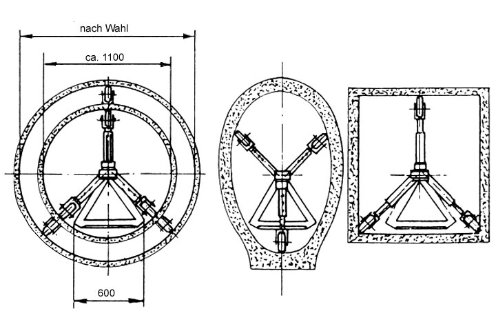 Eine ähnliche Entwicklung, deren Einsatz auch für die Beschichtung von Kanälen und tiefen kreisförmigen Einsteigschächten denkbar ist, fand in den letzten Jahren im Steinkohlenbergbau zur Beschichtung von Großbohrlöchern statt. Die Prinzipskizze des dabei eingesetzten Spritzautomaten, der sowohl im Trocken- als auch Naßspritzverfahren arbeiten kann, zeigt (Image 5.3.1.8.4-1) [Großk85] . Dieses Prinzip findet unter der Bezeichnung "SBS-Molch" bei der Herstellung von Beschichtungen im Trockenspritzverfahren in begehbaren Kanälen (≥ DN 1100) Anwendung.