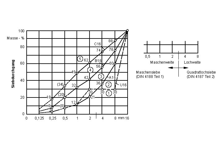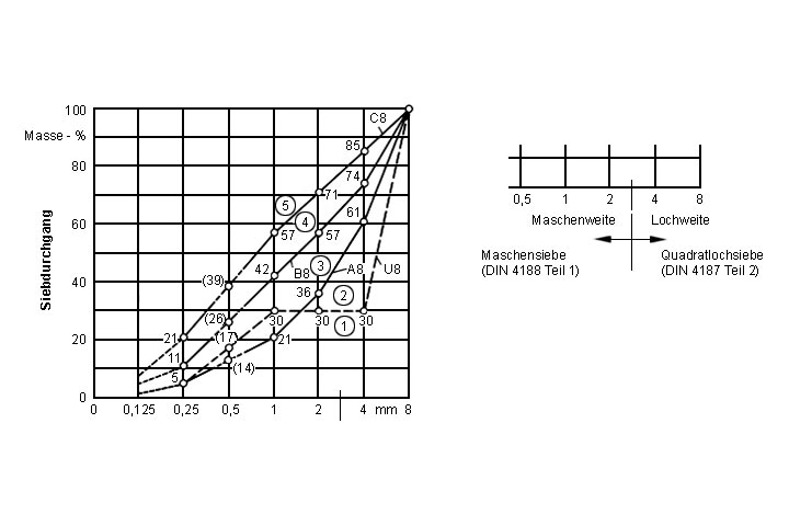 Die Sieblinie muß in der oberen Hälfte des Bereiches 3 oder in der unteren Hälfte des Bereiches 4 nach (Image 5.3.1.8.1-4) bzw. (Image 5.3.1.8.1-5) liegen.