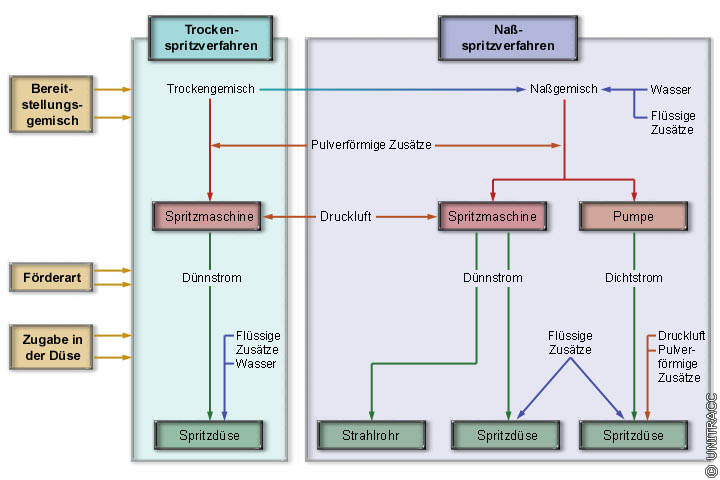 Die einzelnen Abläufe beim Trocken- und Naßspritzverfahren sind im (Image 5.3.1.8.1-3) dargestellt. Die Zugabe der jeweiligen Zusätze im Bereich der Spritzdüse und deren Regulierung erfolgen durch den Düsenführer.
