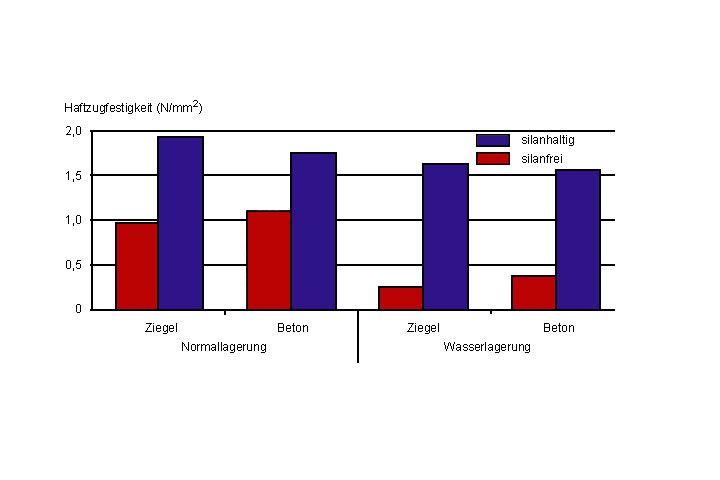 Im Rahmen von Adhäsionsuntersuchungen an Beton mit Beschichtungen auf Epoxid- und Polyurethanharzbasis wurden Silane in geringen Mengen den Beschichtungsstoffen bzw. den Grundierungen zugegeben. Neben einer generellen Verbesserung der Adhäsionseigenschaften gegenüber silanfreien Stoffen konnte eine deutliche Verbesserung der Adhäsionsbeständigkeit gegenüber Wasserlagerung festgestellt werden (Image 5.3.1.2.2.3-1) . Die besseren Adhäsionseigenschaften werden darauf zurückgeführt, daß sich chemische Bindungskräfte (kovalenter Natur) zwischen Silan und den silikatischen Verbindungen des Zuschlags und des Zementsteins ausbilden. Dagegen wird bei silanfreien Bindemitteln lediglich die Ausbildung physikalischer Bindungen mit Dipolcharakter vermutet [Sasse94] .