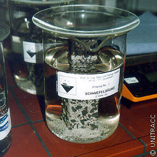 Einlagerung eines Mörtelprismas in Schwefelsäure mit 2 Gew.-% [Quelle: STEIN Ingenieure GmbH] |